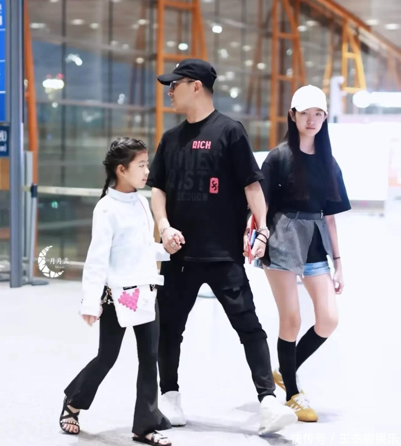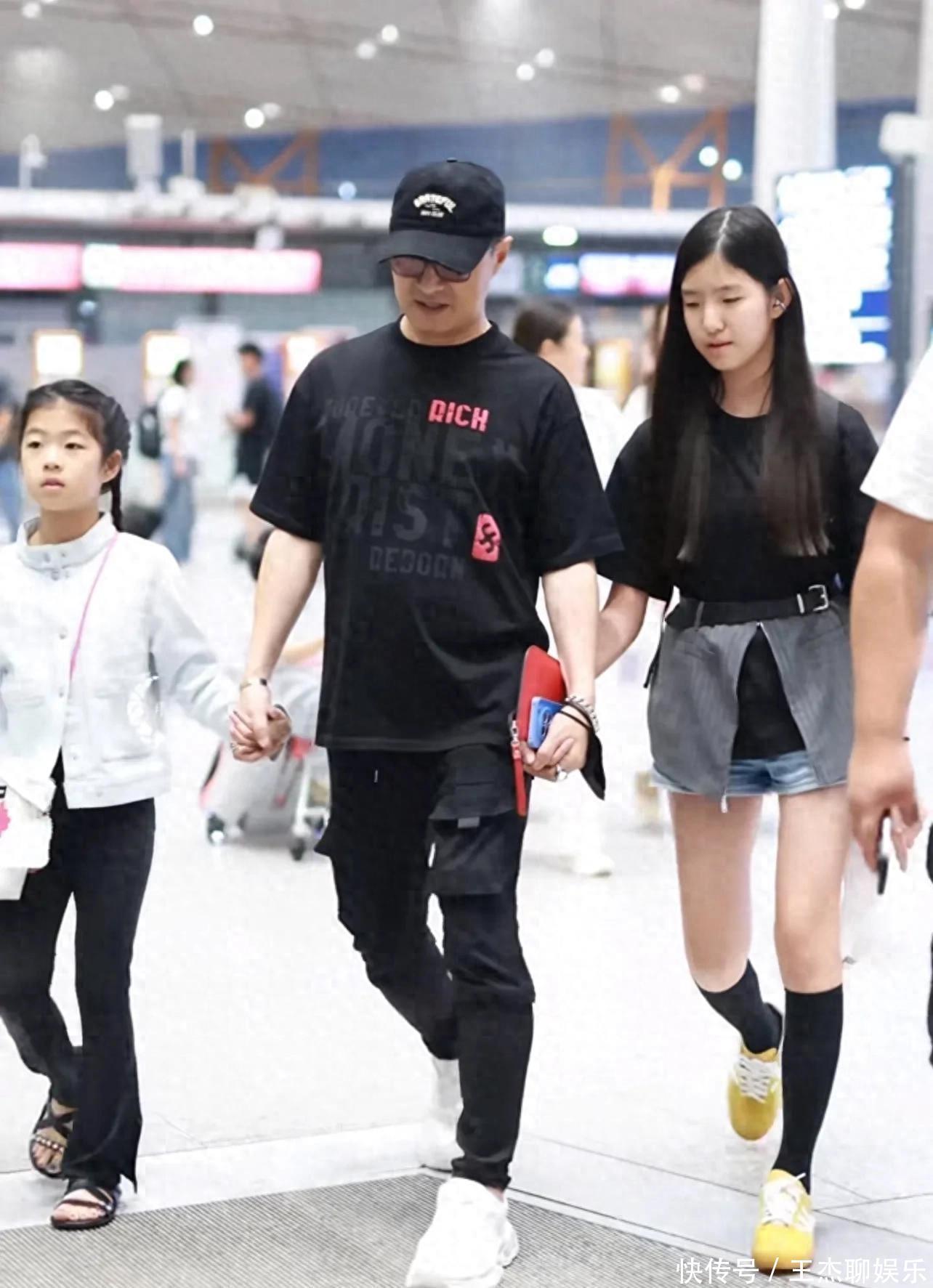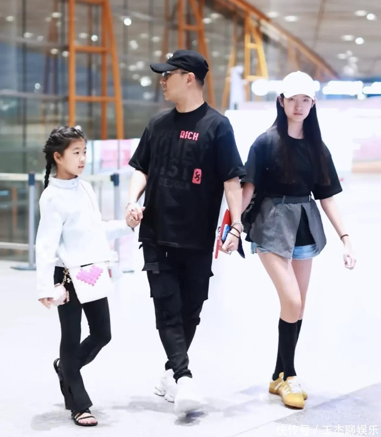 此次全家外出挺穷困的,汪峰穿了黑穿戴一边牵着二女儿一边带着醒醒步碾儿。二女儿穿了条牛仔短裤,醒醒穿了玄色裤子,两个东谈主都长腿。老迈戴着墨镜坐在前边,看年岁照实像大学生了。后头还有个保姆推着行李箱,上头坐着他五岁的犬子。