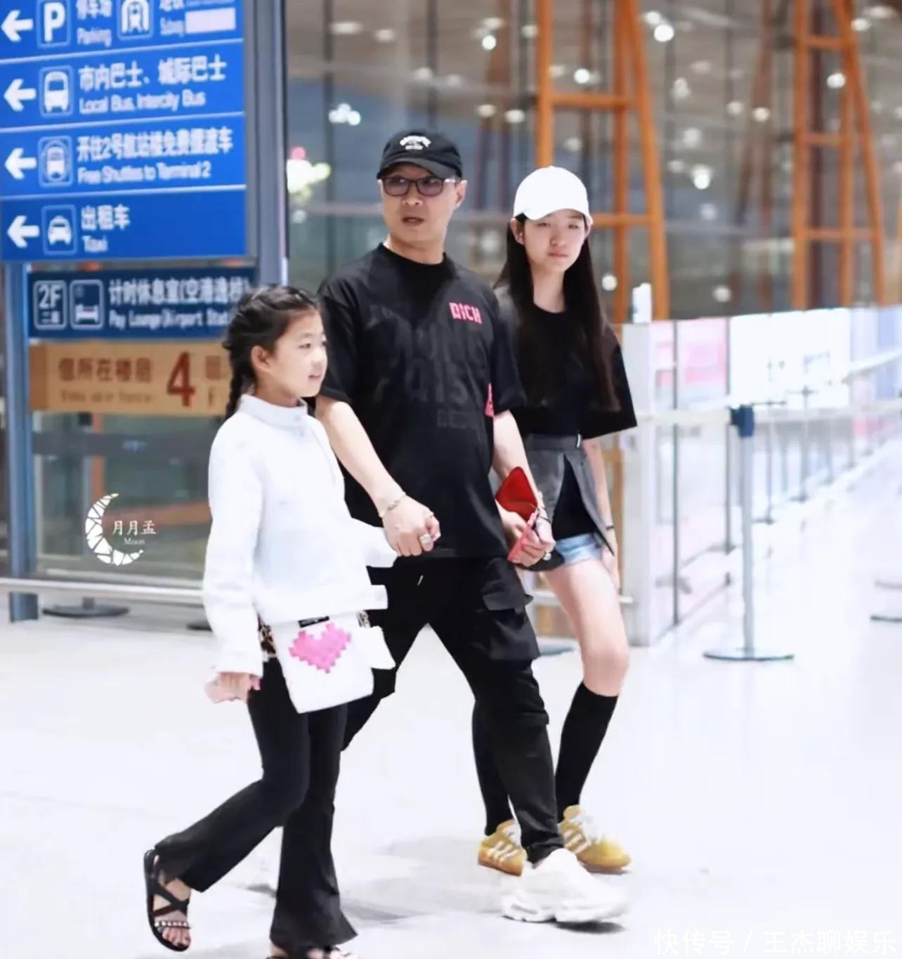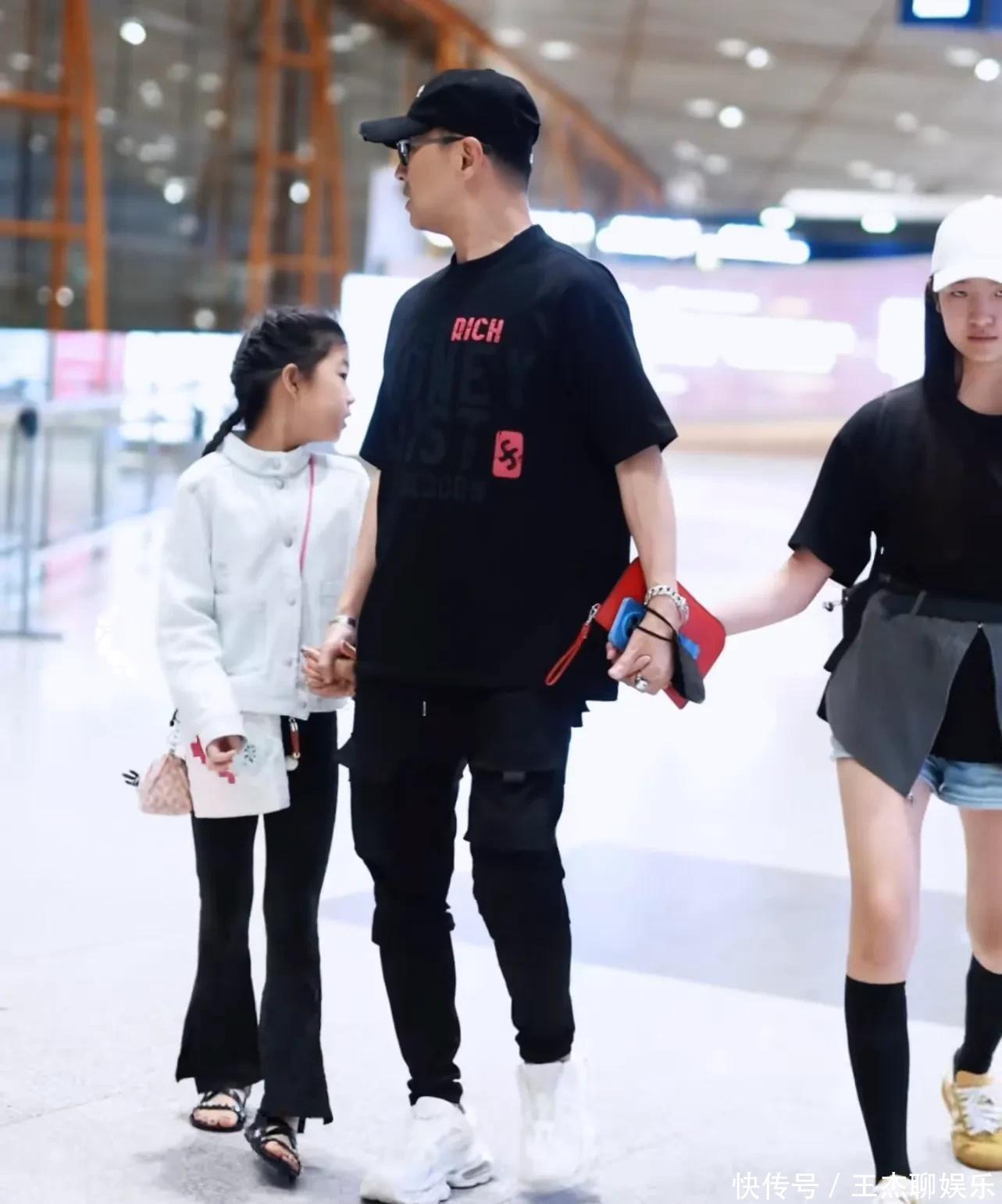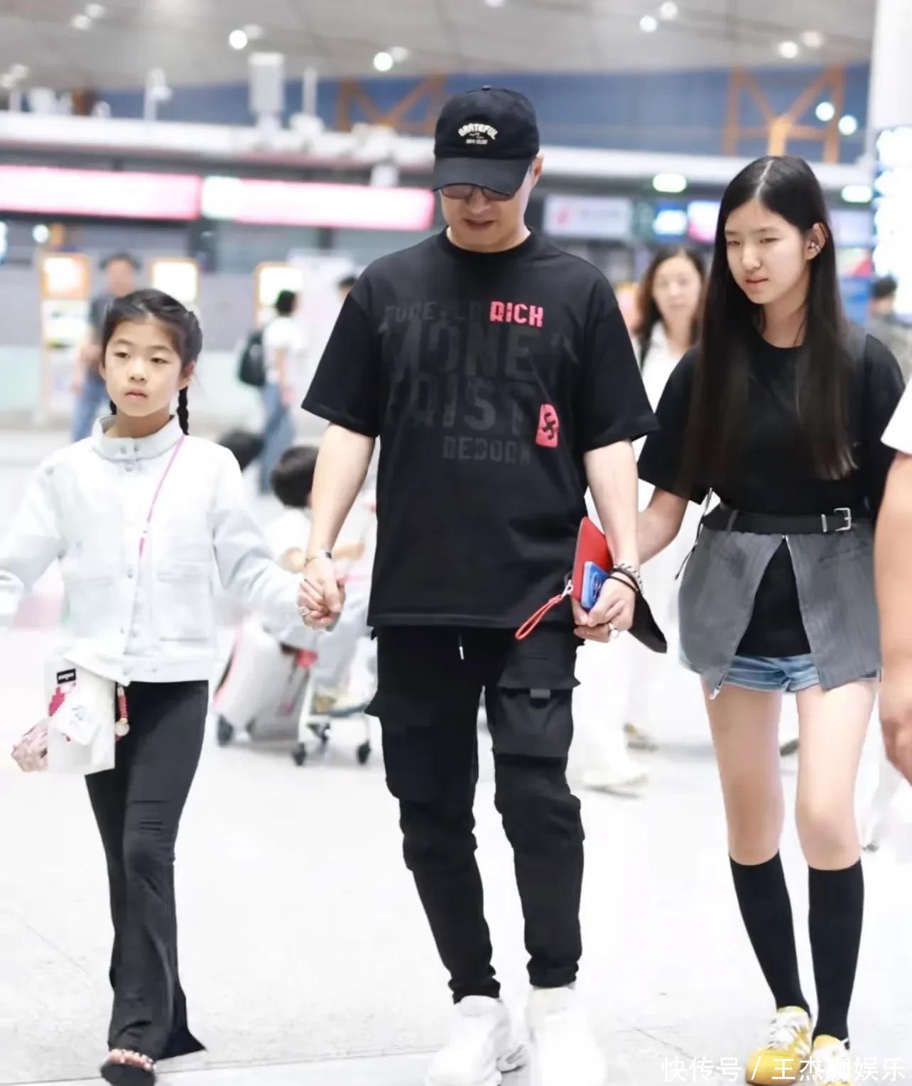 此次全家外出挺穷困的,汪峰穿了黑穿戴一边牵着二女儿一边带着醒醒步碾儿。二女儿穿了条牛仔短裤,醒醒穿了玄色裤子,两个东谈主都长腿。老迈戴着墨镜坐在前边,看年岁照实像大学生了。后头还有个保姆推着行李箱,上头坐着他五岁的犬子。